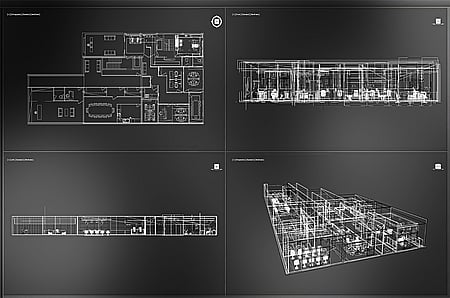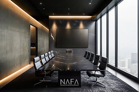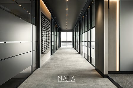 This illuminated floor plan presents the strategic blueprint for WLL Meridian 600 sqm Headquarters in Doha, Qatar. Tailored for a leading oil and gas pipeline company, the layout efficiently organizes space for 30 personnel across 21 zones, encompassing executive suites, departmental offices, modern conference rooms, and support areas. The view reveals optimal workflow and clear zoning, accentuated by the interplay of light and shadow on rich, dark marble flooring. Illuminated pathways define circulation, guiding movement and underscoring the core design objective: blending operational efficiency with executive prestige, reflecting WLL Petro Pipe's industry leadership